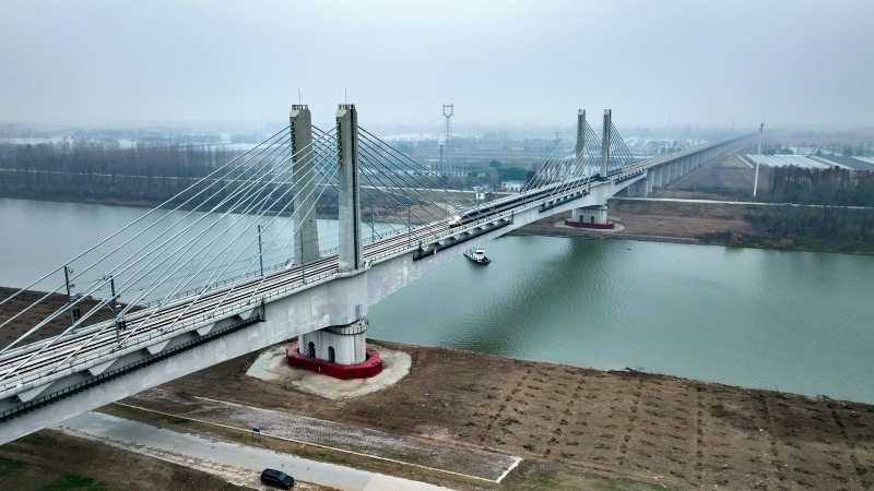 在全線重難點控制性工程新溝漢北河斜拉橋施工中,中鐵十二局建設(shè)者將原設(shè)計的懸臂澆筑法優(yōu)化為大跨度支架現(xiàn)澆法,有效節(jié)省工期近3個月;同時采用“鋼管柱+工字鋼大橫梁+321型貝雷梁+盤扣式滿堂支架”系統(tǒng)進行施工,并引入自動化監(jiān)測系統(tǒng),24小時自動監(jiān)測支架受力狀態(tài)、傾斜狀況及變形情況,成功克服了汛期環(huán)境下河道橋梁分段施工穩(wěn)定性差的難題,為線路如期通車提供了堅實保障。